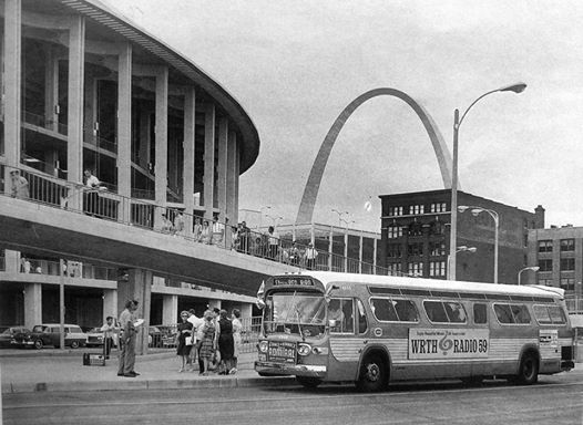 The scene is the south side of Busch Stadium II where a Redbird Express bus has pulled up in 1966, the year the stadium opened. Both the baseball and football Cardinals played there beginning that year, moving from the old Sportsman’s Park (Busch Stadium I) on North Grand Boulevard.