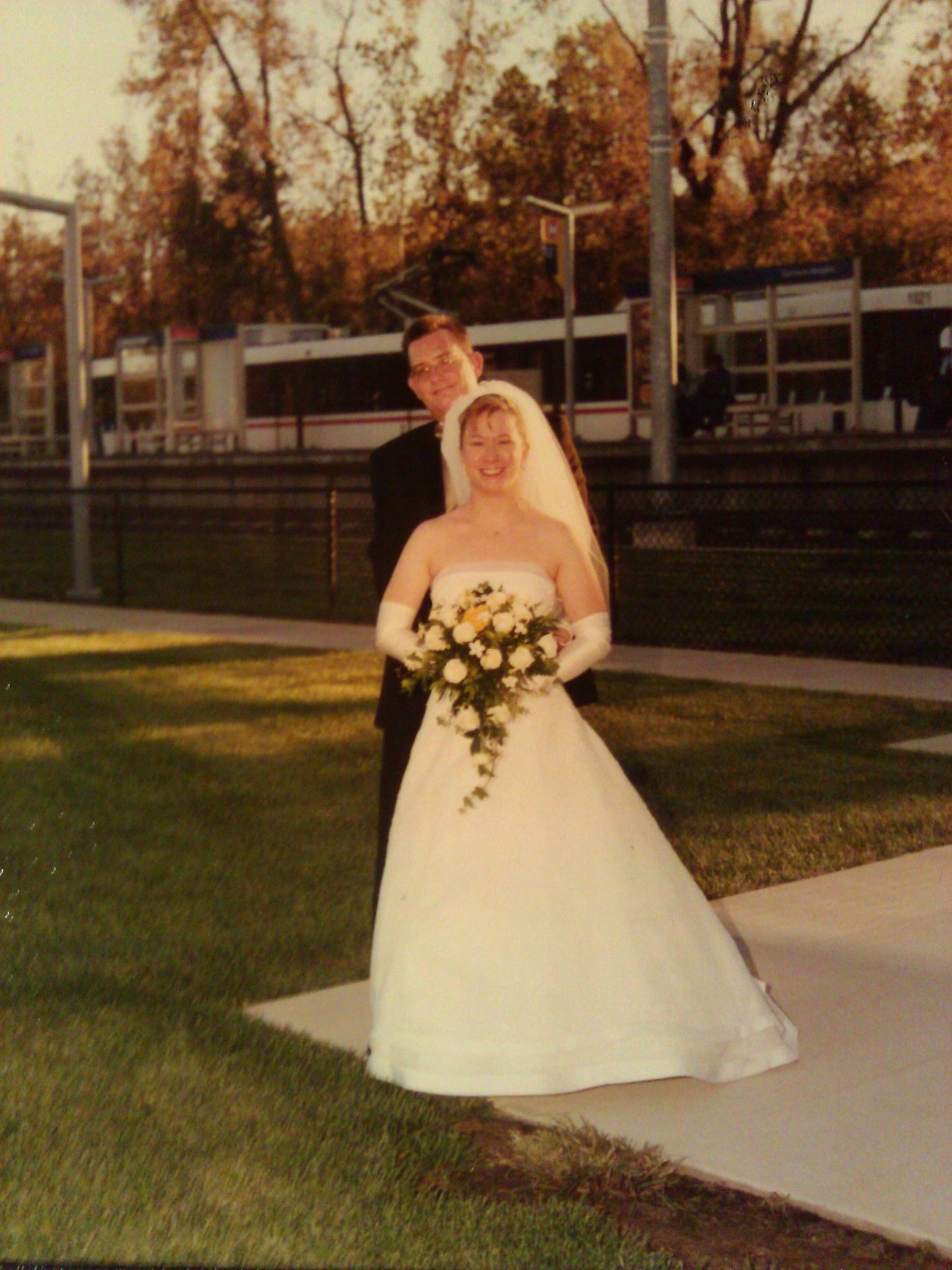 On October 18, 2003, Kristen and Chris were married and, once again, MetroLink played a part – albeit a smaller one. One of their wedding photos includes the Fairview Heights MetroLink Station as a backdrop.