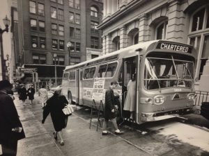 According to the Museum of Transportation, the photo above is one of the new buses at a demonstration point in the heart of Downtown St. Louis. It was displayed right outside of the Old Courthouse.