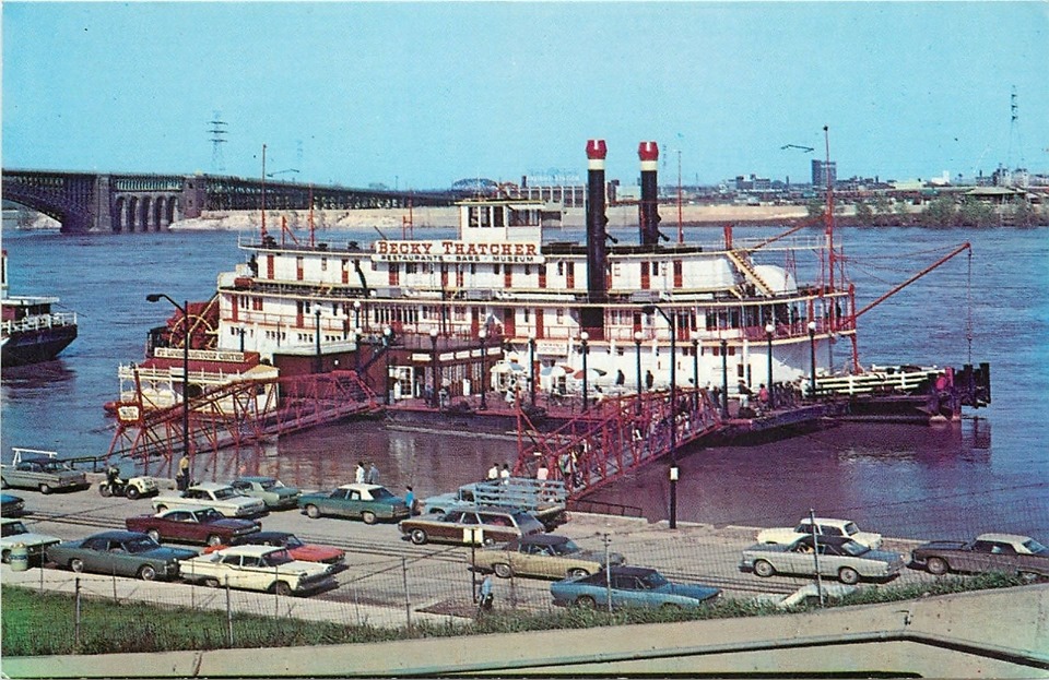 The Becky Thatcher (formerly called the Mississippi III) on the riverfront with Eads Bridge in the background. The year is 1969.