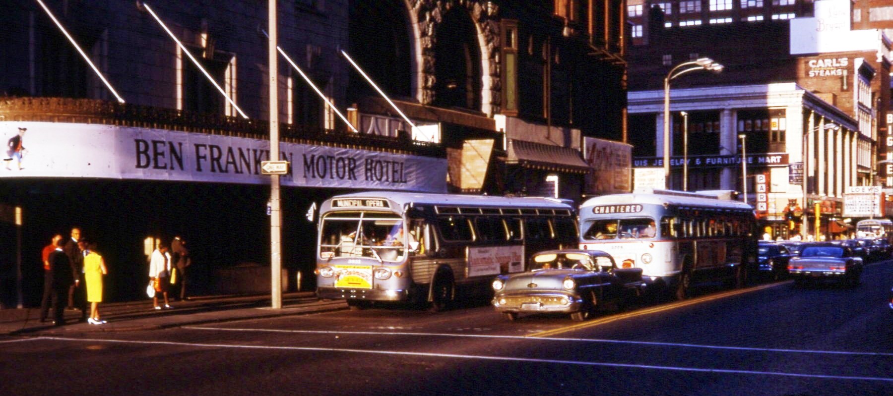 Return to BlogWere you able to guess today’s location and year? You are looking at two westbound buses as they pass by the Ben Franklin Motor Hotel in August 1967.